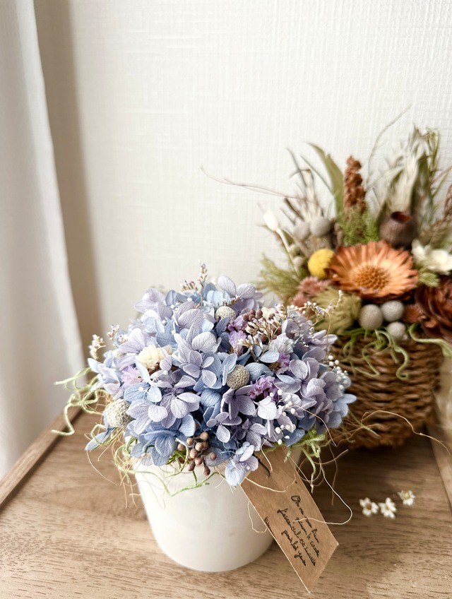 受注!再‥販!ドライフラワーバスケットアレンジ ホワイト×ライトブルー
