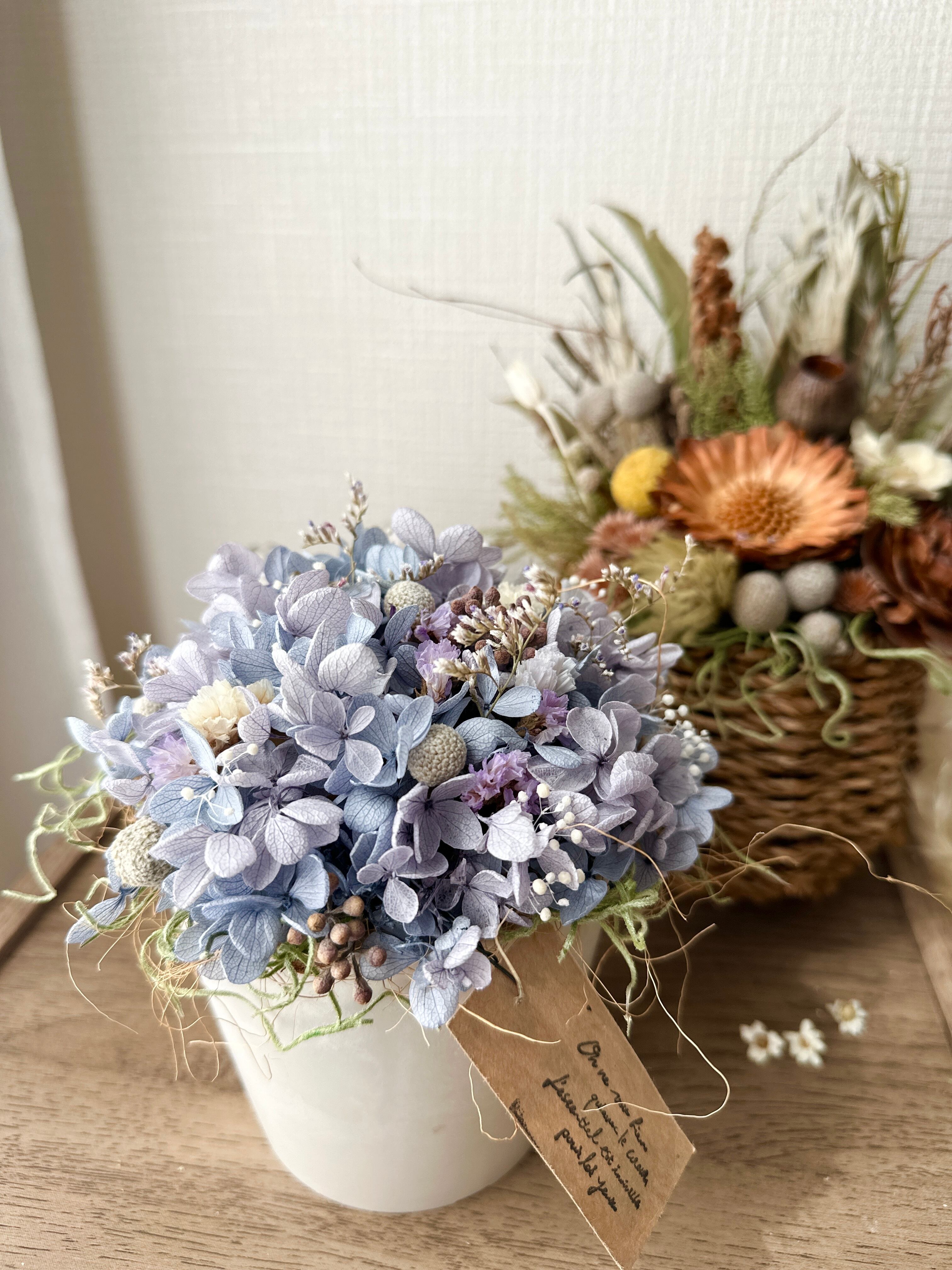 爽やかな紫陽花をデコレーションしたアレンジポットです。