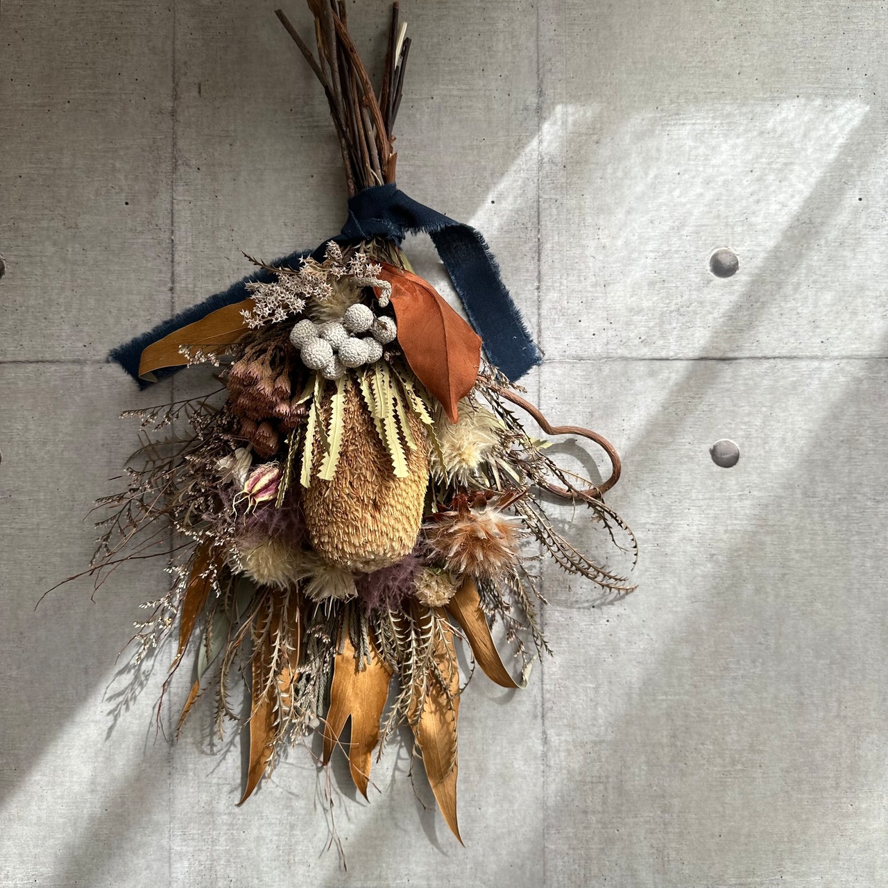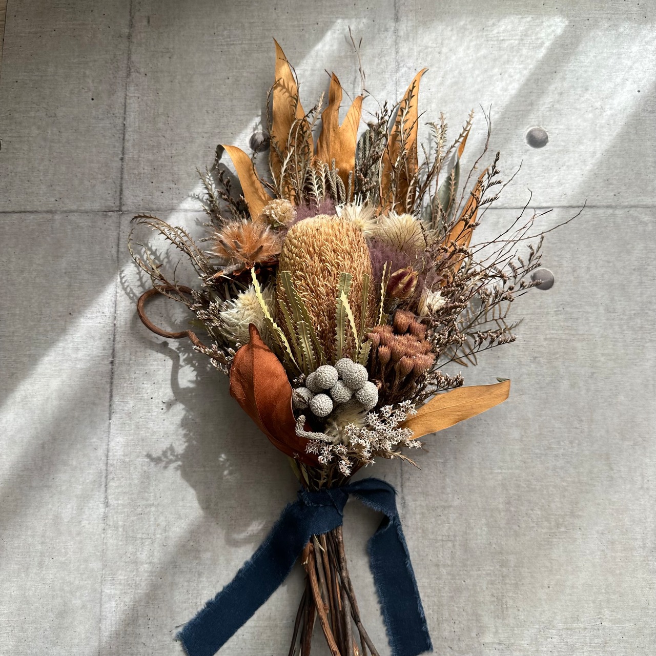 バンクシアメインに、グレビレアゴールド、シルバーブルニア、フィリカ、アイバンホー、スモークツリーなど、たっぷりの人気ドライフラワーをネイビーのリボンで束ねました。